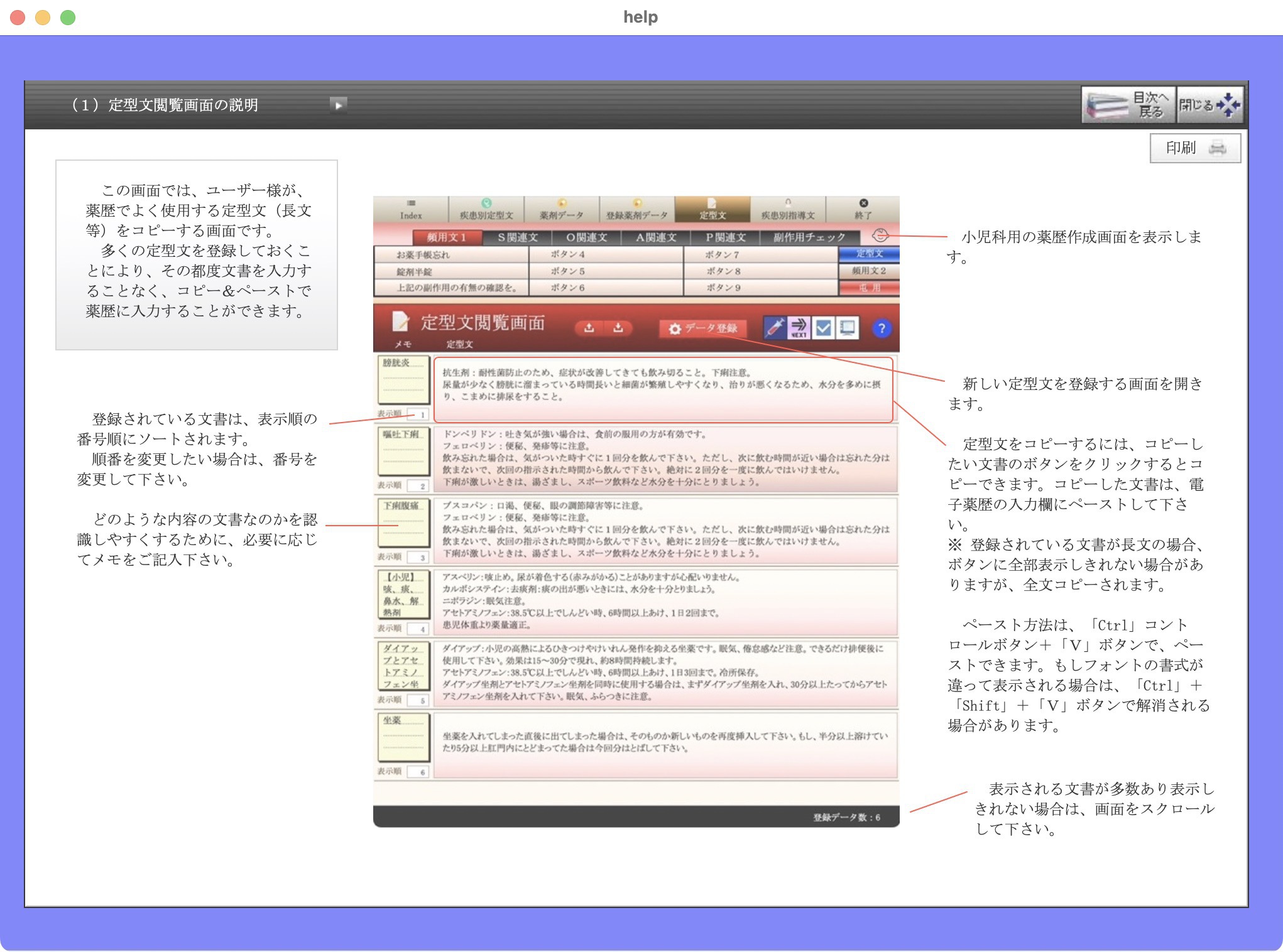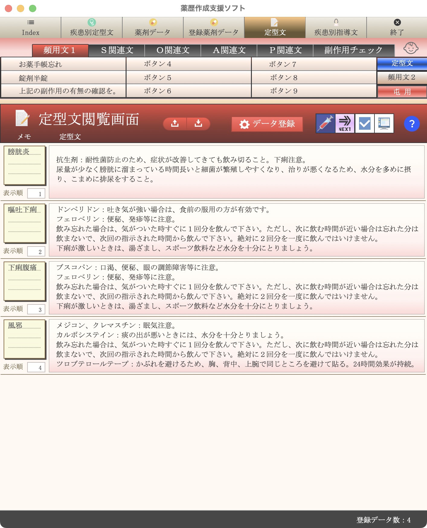 副作用のチェックボタンやお薬手帳を忘れた場合の指導文書、シロップ剤の保存方法、小児科用の定型文等のボタンもございますので、必要に応じてご利用下さい。